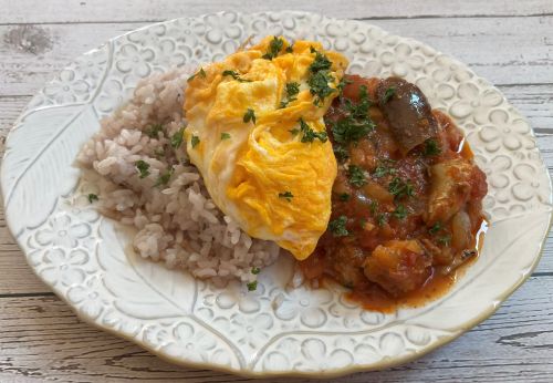 - 雑穀ご飯、トマトソースにオムレツをのせあればパセリを飾って完成です。