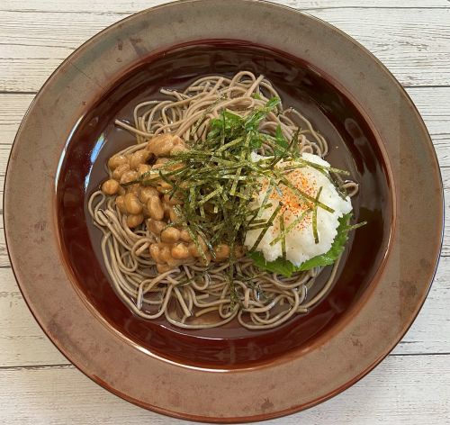 - 器にそばを盛り、大根、納豆、大葉、刻みのりを盛り付けてお好みで七味をかけめんつゆを貼って完成です。