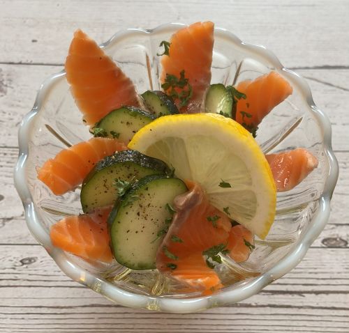 - オリーブオイルとレモン汁をよく混ぜ合わせて盛り付けたサーモンとズッキーニにかけ、あればパセリを振りレモンを添える。