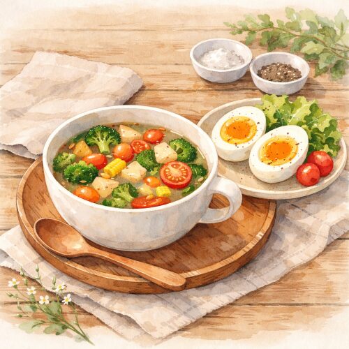 朝食例 野菜たっぷりの野菜スープとゆで卵
