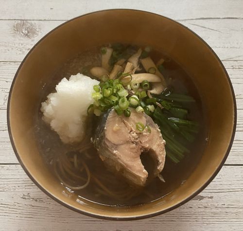 昼食例 焼ききのこと鯖水煮缶のせおろしそば